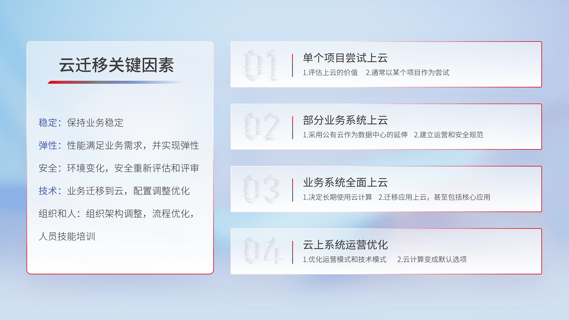 结合实际业务,,,,从规划设计、、、云平台选型、、、、云原生改造、、数据迁移、、集成交付,,,,迁移全过程为客户识别最佳上云路径,,做好风险识别管理,,,设计网络架构、、身份权限、、、安全审计合规、、、、操作审计、、、日志审计、、、、监控告警策略、、多站点容灾设计等,,,对云上基础设施进行整体规划,,,提升IT治理水平,,以满足弹性、、、高可用、、高性能的需求。。。。