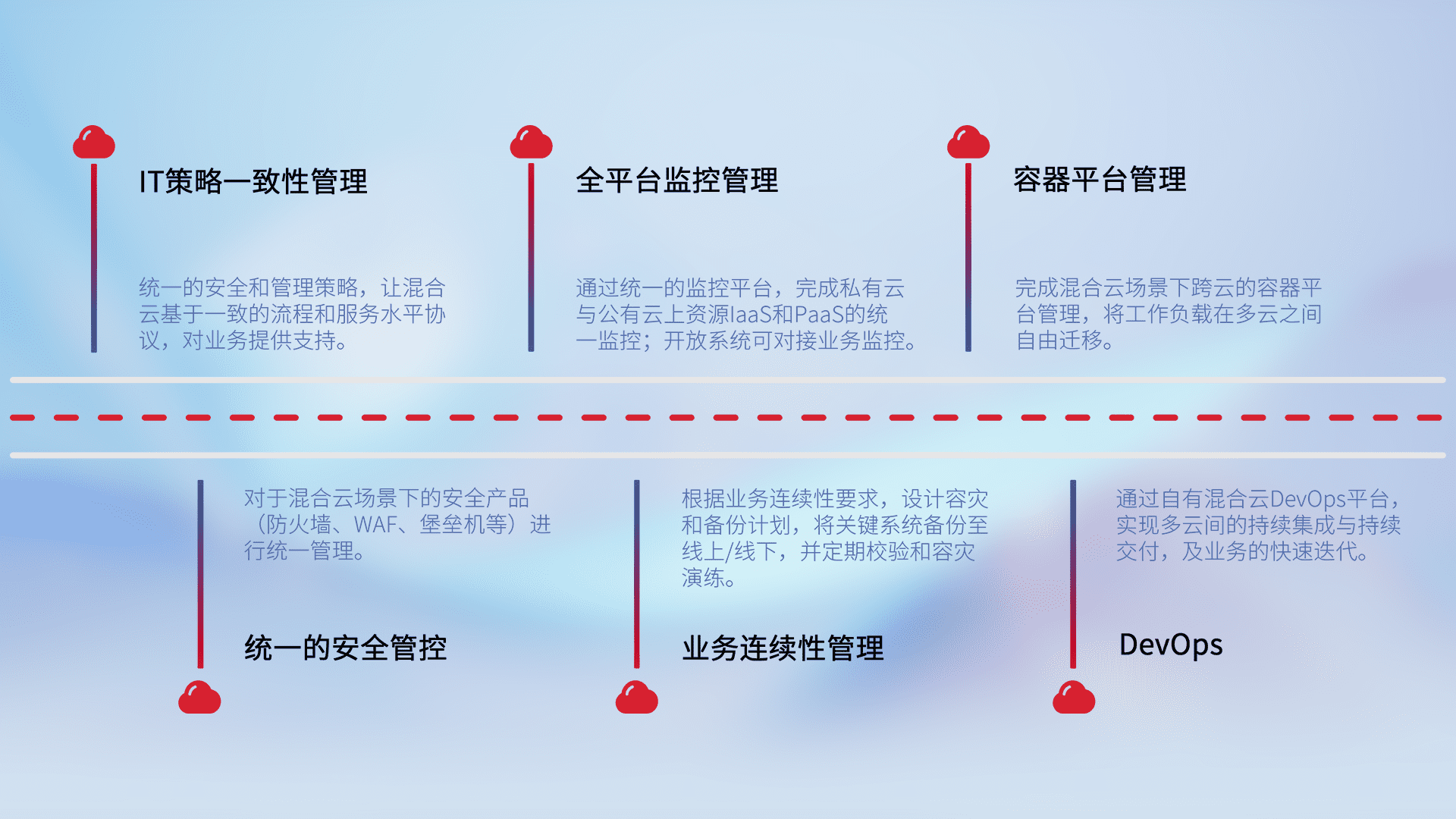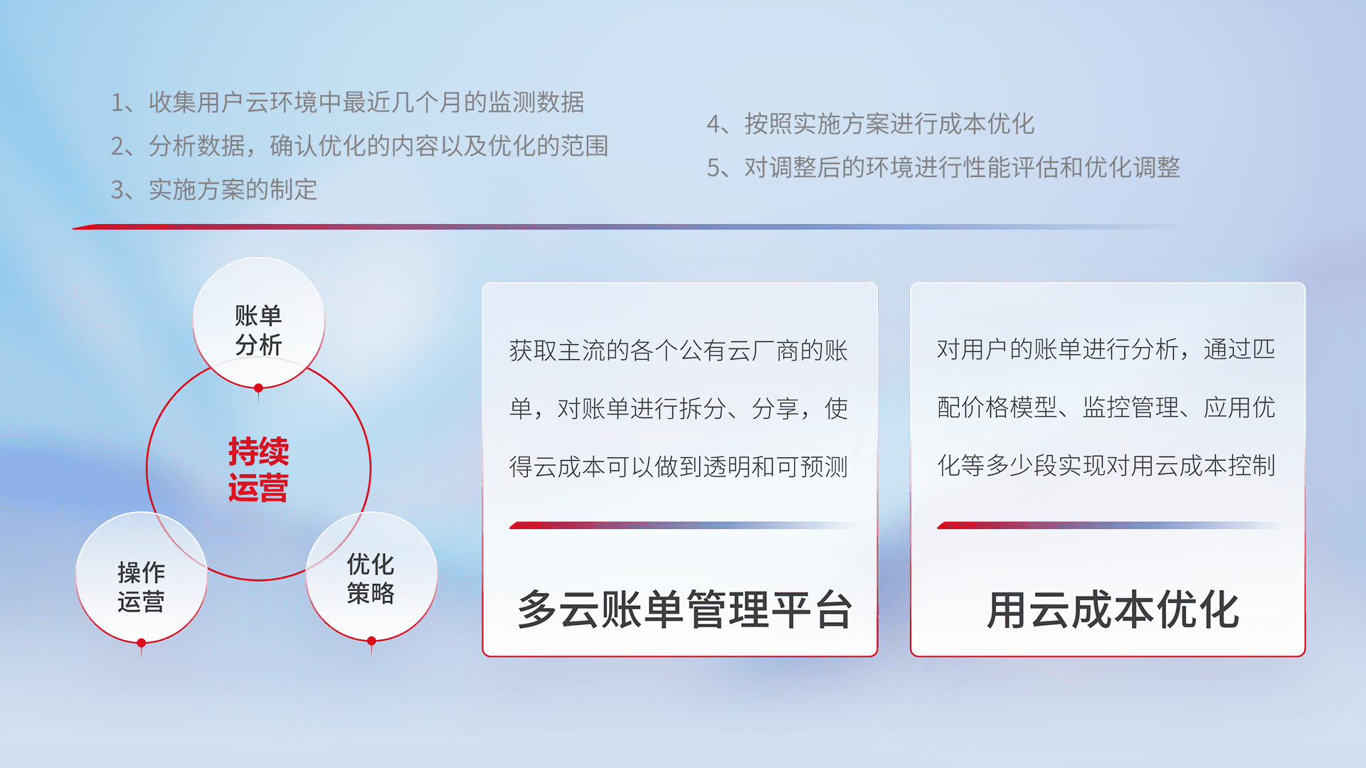 通过多云纳管,,,,以统一的资源数据模型把客户的云资源进行抽象和封装,,,进而实现对多云资源的统一操作,,,,保障云资源管理的可靠性、、、、稳定性与可用性。。量身定制化运维内容,,,,配置、、、开发运维、、补丁管理、、、备份、、、、监控、、、认证和访问管理、、审计和日常巡检等,,,,保障在用云过程中的可靠度,,,稳定度以及高可用率。。