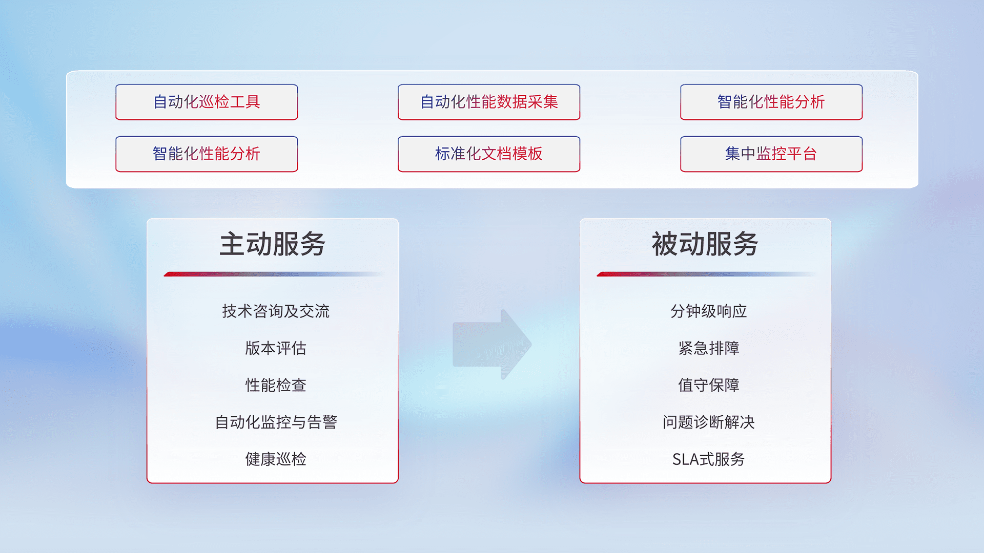 智能化工具和标准化文档,,,,保障服务质量,,提供主动服务(包含技术咨询、、、、版本评估、、、性能检查、、、自动化监控与告警、、健康巡检)和被动服务包含(分钟级响应、、紧急排障、、值守保障、、问题诊断解决、、、、SLA服务)。。。